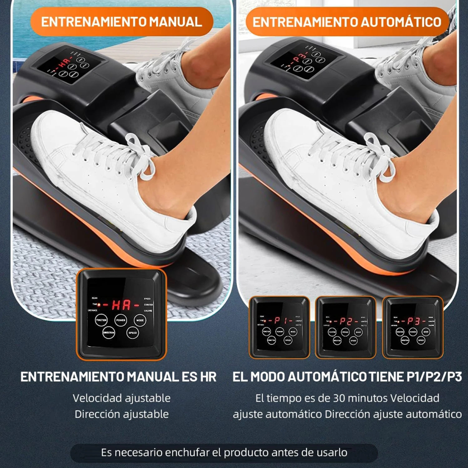 Pantalla: Monitor digital con registro de tiempo, calorías, repeticiones y distancia